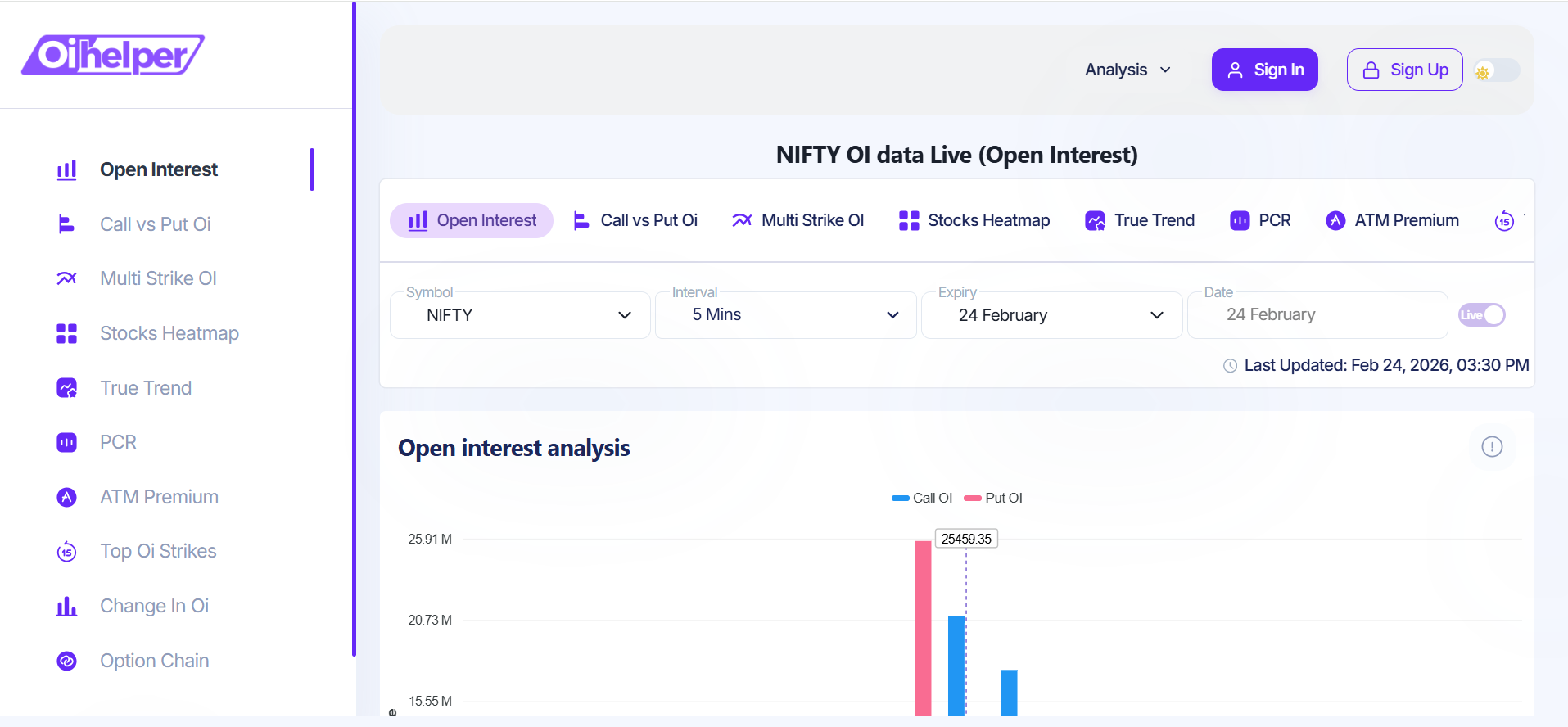 Oihelper is a FinTech SaaS platform that transforms complex options trading data into actionable insights. It provides real-time open interest analysis, option chain tracking, and market sentiment indicators through a clean, interactive dashboard to help traders make informed decisions.